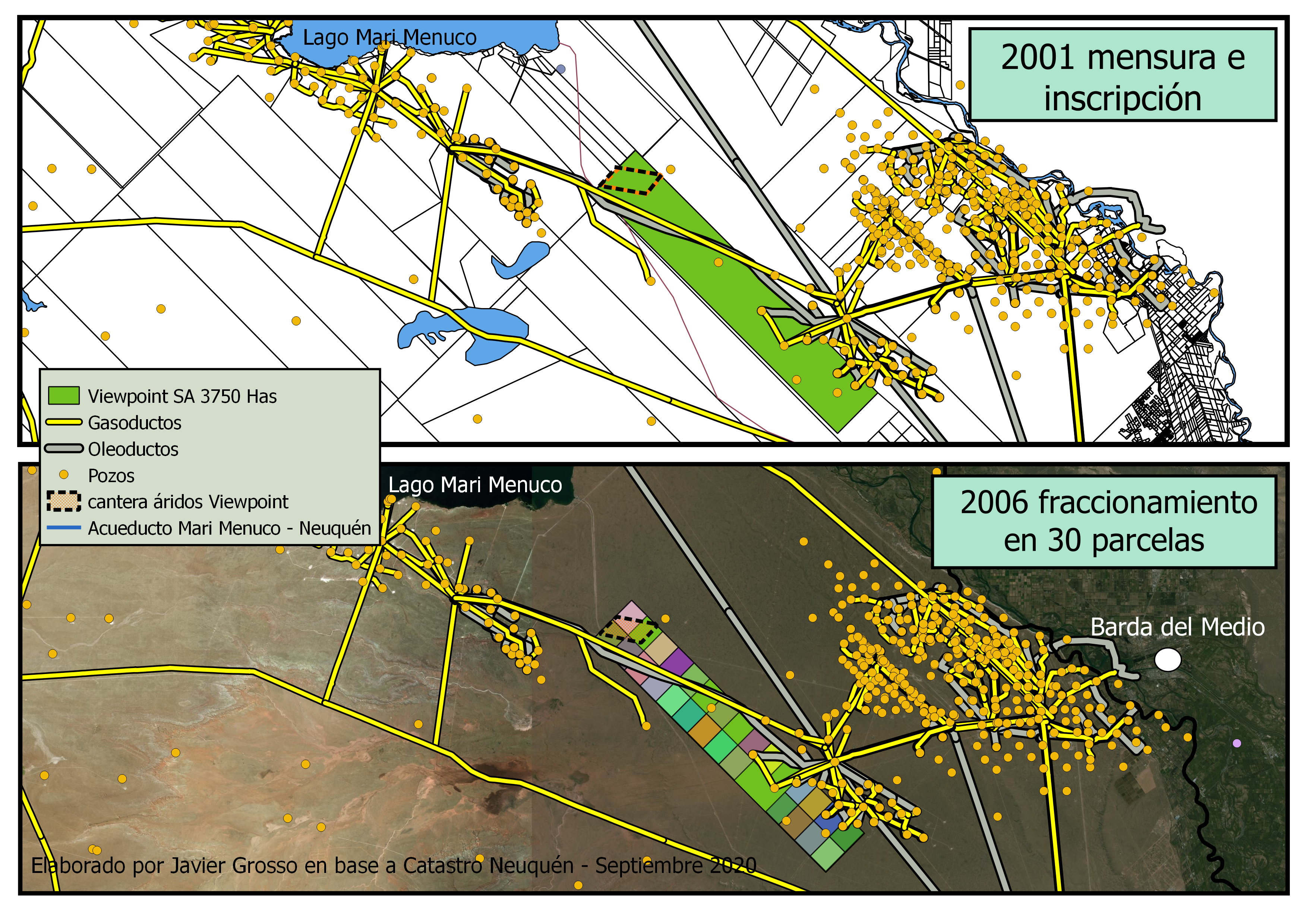 A Vietwpoint en 2001 Catastro le registró la propiedad del campo ubicando dentro del Yacimiento Lindero Atravesado que opera Pan American Energy. Luego le aprobó la subdivisión en 30 parcelas con fines que anticipan próximas operaciones. Minería le otorgó la concesión de una cantera de áridos en 2018 a la firma que en ese expediente aparece con domicilio en Cipolletti (RN).