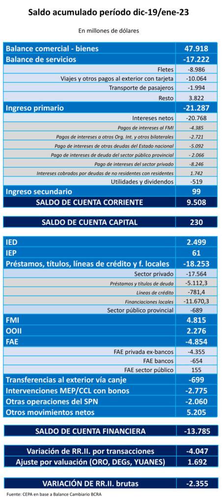 "Esa cancelación neta de financiaciones locales" —sostiene CEPA— "no se puede explicar por una necesidad de los bancos, ante una caída en los depósitos bancarios en moneda extranjera que permiten fondear esas financiaciones, ya que entre noviembre de 2019 y enero de 2023 los depósitos en moneda extranjera en el sistema bancario cayeron apenas de 20.787 a 19.628 millones de dólares (manteniendo de punta a punta casi el 95% del stock inicial)". La explicación es que "los sectores exportadores buscaron reemplazar la deuda local en dólares por deuda en moneda local". De esos dólares del superávit comercial