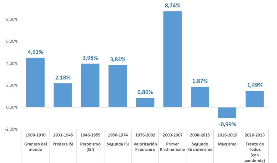 - La Argentina como granero del mundo, entre 1900 y 1930, creció a un ritmo de 4,5% por año;