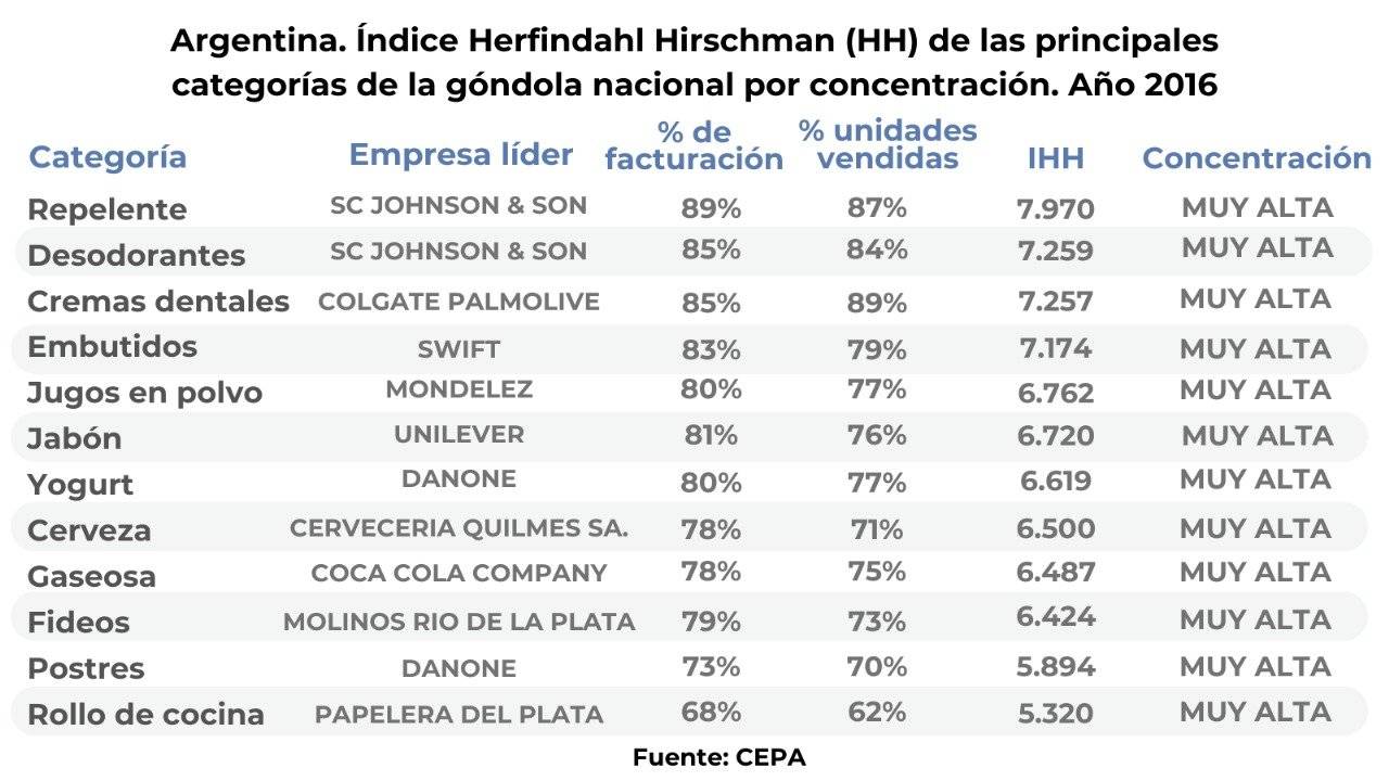 Milei adscribe a la escuela austríaca, la cual niega las fallas de mercado (¡que hoy reconocen hasta los propios neoclásicos!). Los austríacos dicen que la competencia está impedida porque el Estado la dificulta artificialmente. Sin embargo, en los principales sectores económicos de la Argentina no hay competencia, hay cartelización, sin que pueda atribuirse al Estado. Veamos el índice de concentración Herfindahl Hirschman (HH): da altísimo en alimentos básicos, productos de limpieza e higiene personal.