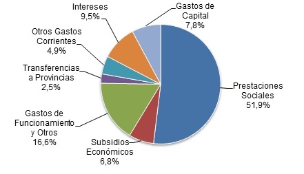 El 52% de los gastos del Estado corresponden a prestaciones sociales (y allí dentro, el 75% son jubilaciones y pensiones), lo que convierte a este rubro en una fuerte tentación para la tijera. El 17% son gastos de funcionamiento y otros, donde se encuentra el gasto en personal estatal, los intereses son el 9,5%, el 8% son gastos de capital, los subsidios económicos – gas, luz y transporte, fundamentalmente— son el 7%, el 5% son otros gastos corrientes, de los cuales la gran mayoría (70%) corresponde al presupuesto de las universidades públicas y el restante 30% a los gastos vinculados a las empresas estatales. Por último, el 2,5% son transferencias a provincias. Cabe aclarar que los intereses de deuda no incluyen 122.551 millones Intra Sector Público Nacional, ya que Cambiemos realizó dos modificaciones en la presentación de los resultados fiscales con la clara intencionalidad de netear el peso creciente de los intereses por endeudamiento y mostrar un mejor resultado fiscal mediante el denominado Gasto Primario.