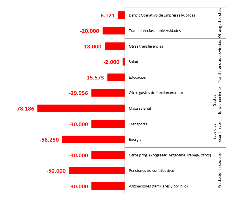 * Recorte a las provincias, a través de dos vías. En educación, salud y otros probablemente cerca de 45.000 millones, un 30% de lo que reciben actualmente. En gastos de capital (inversiones) en energía, transporte educación, vivienda y agua potable el recorte asciende a 9.000 millones.