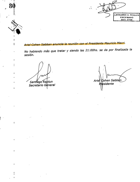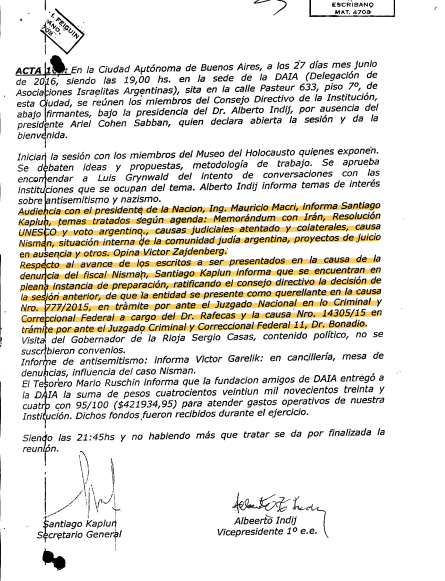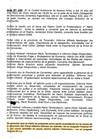 Estos datos surgen de papeles muy conocidos para las partes, y volvieron a verse en las últimas audiencias. El abogado de Carlos Zannini, Mariano Fragueiro, mostró dos memorias de reuniones de la Comisión Directiva de la DAIA, antes y después del encuentro con Macri.