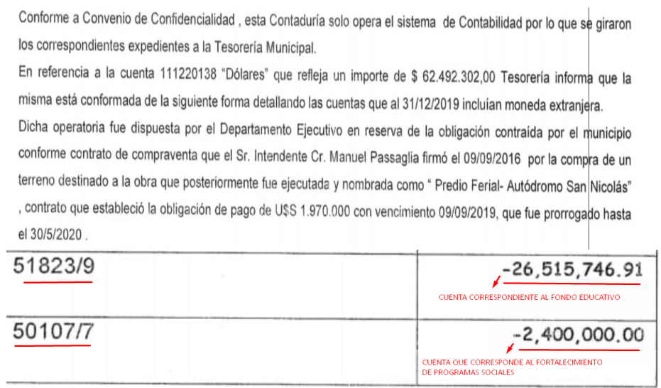 Los bloques de concejales opositores rechazaron la rendición de cuentas de 2019 del intendente Passaglia y en un comunicado fundamentaron su decisión por ver “con preocupación los límites de legalidad que ejerce el municipio”, expresaron. “En años anteriores, en esta misma instancia denunciábamos la no utilización del Fondo de Financiamiento Educativo. Nos preocupaba que no sea utilizada esa herramienta destinada a mejorar la infraestructura de las escuelas y a garantizar que todos los alumnos y alumnas nicoleñas puedan seguir asistiendo s clases”. Señalaron que durante 2019 “dicho fondo fue utilizado para la compra de dólares destinados al pago del terreno del Predio Ferial y Autódromo, sede de la Expoagro. También el Fondo de Fortalecimiento de Programas Sociales se desvió para esta compra. Cabe aclarar que éste último sirve para asistir a personas en situación de vulnerabilidad y no para lo que fue destinado”, sostuvieron.