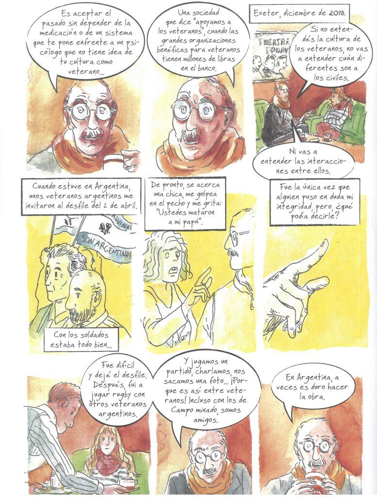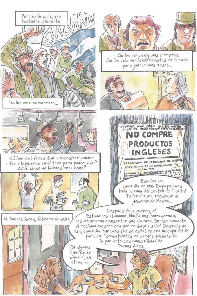 Es que Turba se nos presenta como un viaje personal de su autora por una idea tan inusual como atrapante: una historieta sobre las Malvinas. En ese derrotero, la seguimos por todas sus ideas pero también por sus dudas al enfrentarse como investigadora con una historia tan rica como demoledora. Donde encontramos el dolor de quienes perdieron todo allí, pero también de quienes creyeron ganarlo para luego enfrentarse al mismo olvido y ocultamiento. Son también los cruces con quienes han participado pero recuerdan o reivindican de un modo diverso aquello, y nos enfrentan a esa densidad que va adquiriendo con los años Malvinas, como suceso histórico pero también como reclamo, dolor, angustia, honor, reivindicación. En varios pasajes la pregunta sobre la heroicidad carcome los relatos cerrados que pudieron organizar los actos oficiales, y nos enfrentan a nuestras propias dudas y recuerdos.
