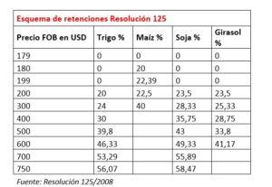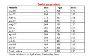 En el año 2007 el precio más alto de la soja en grano fue en diciembre de ese año y se ubicó en 437 dólares y el nivel de retenciones se había establecido en 35%; comparativamente el precio actual es de 607 dólares y el nivel de retenciones es del 33%. En el caso del trigo para el mismo año, también el máximo nivel se registró en diciembre siendo de 339 dólares la tonelada, el derecho de exportación requerido en ese período fue del 28%, mientras que en la actualidad el precio es de 392 dólares y la tasa de retención es del 12%. Respecto del maíz el máximo del año 2007 fue en octubre con una marca de 168 dólares, aplicándosele una retención del 25%. A la fecha el maíz alcanzó un precio de 290 dólares, imponiéndosele una retención del 12%. La renta diferencial capturada por los sectores propietarios es sustantivamente mayor en la actualidad respecto a aquél momento donde había imperado una tendencia de marcado crecimiento de precios. Esto explica buena parte del deterioro salarial actual, sobre todo respecto de la canasta alimentaria. Además puede observarse un pobre desacople con relación a los precios internacionales, lo que muestra la injustificada reacción de las gremiales empresarias empeñadas en obturar cualquier intento gubernamental por adecuar el nivel de los derechos de exportación a las necesidades de los requerimientos macroeconómicos y la urgencia de promover una mayor justicia social.