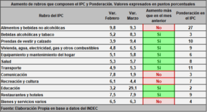 Hacer hincapié en la estacionalidad en la determinación del IPC es impreciso cuando de 12 rubros que lo componen, 8 tuvieron aumentos mayores a los del mes anterior. Esto no quiere decir que no haya condiciones particulares que expliquen determinadas alzas, pero sus efectos se propagan dentro de una tendencia general. En particular, educación, que tuvo el crecimiento más alto del mes de marzo (29,1 %), tiene un peso muy bajo en el IPC nacional, con una ponderación del 2 %, con lo que, del aumento total del 7,7 % que tuvo lugar en marzo, solamente da cuenta del 0,58 %, mientras que el 7,12 % restante se divide entre los otros.