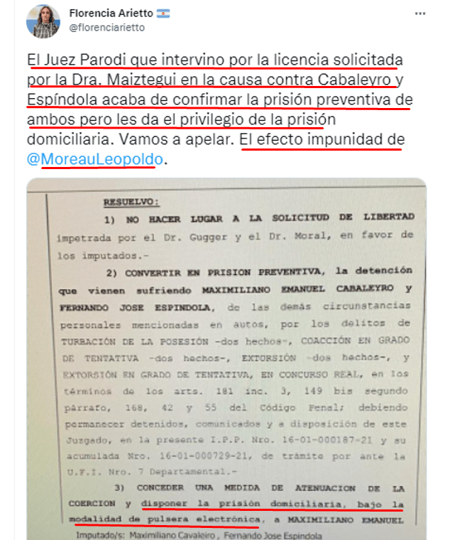 Rápida en operación y tuiteo, la abogada de los Rey expresó que apelaría la decisión y apuntó que la resolución de Parodi se debía “al efecto impunidad de Leopoldo Moreau”.