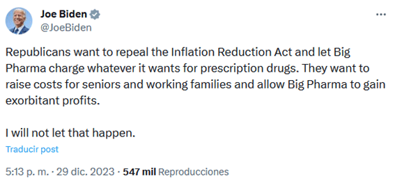 “Los republicanos quieren derogar la Ley de Reducción de la Inflación y dejar que las grandes farmacéuticas cobren lo que quieran por los medicamentos recetados. Quieren aumentar los costos para las personas mayores y las familias trabajadoras y permitir que las grandes farmacéuticas obtengan ganancias exorbitantes. No dejaré que eso suceda”.