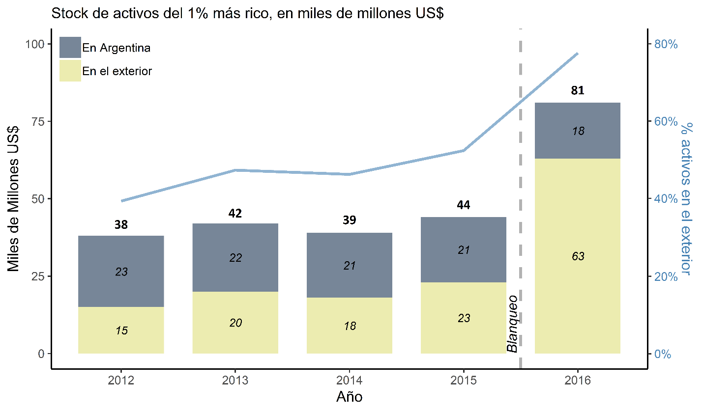 El stock de riqueza del 1% más rico pasó así de U$S 44.000 millones en 2015 a U$S 81.000 millones en 2016. Prácticamente dicho aumento se produjo gracias a los bienes en el exterior, al crecer de los U$S 23.000 millones en 2015 a los 63.000 millones en 2016. La élite mantuvo estos bienes escondidos de los radares de los agentes tributarios, y como consecuencia, la proporción de activos en el exterior pasó del 50% al 77%.