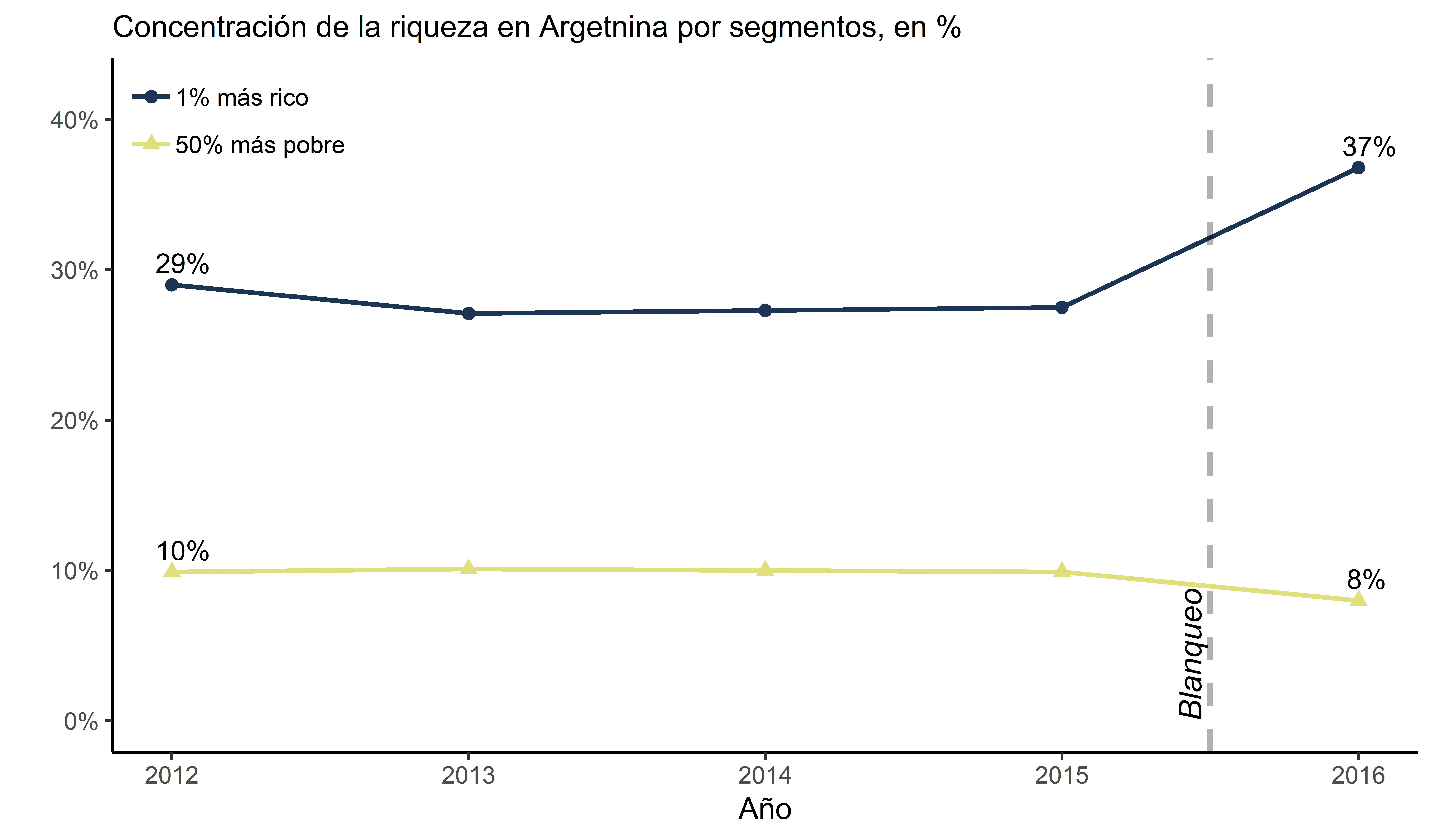 Como consecuencia del blanqueo, conocemos que el 1% más rico concentra el 37% del stock de riqueza en bienes personales, cuando antes del mismo alcanzaba la proporción nada despreciable del 29%. Ni siquiera el 50% más pobre logra asomarse a los tobillos del 1% más rico, y menos aún luego del blanqueo. El segmento más pobre de la población concentra meramente un nivel de riqueza inferior al 10% del total.