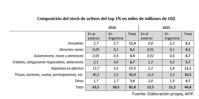 Los rubros de las familias más ricas con mayor dinamismo, fruto del blanqueo, fueron aquellos que poseen un alto grado de liquidez. Se destacan los títulos y participaciones en empresas, los cuales se incrementaron de U$S 16.000 millones en 2015 a 42.000 millones en 2016. De este monto, los títulos y participaciones en el exterior fue el renglón que más aumentó en términos absolutos. Le siguen los depósitos en el exterior los cuales más que se duplicaron, de 5.000 a US$ 13 mil millones. Paradójicamente, dentro de los activos menos líquidos los inmuebles en el exterior crecieron explosivamente. Cabe destacar que el 1% más rico concentra el 66% de los bienes totales declarados en el exterior. Esto quiere decir que los más ricos tienen una amplia propensión a fugar capitales.