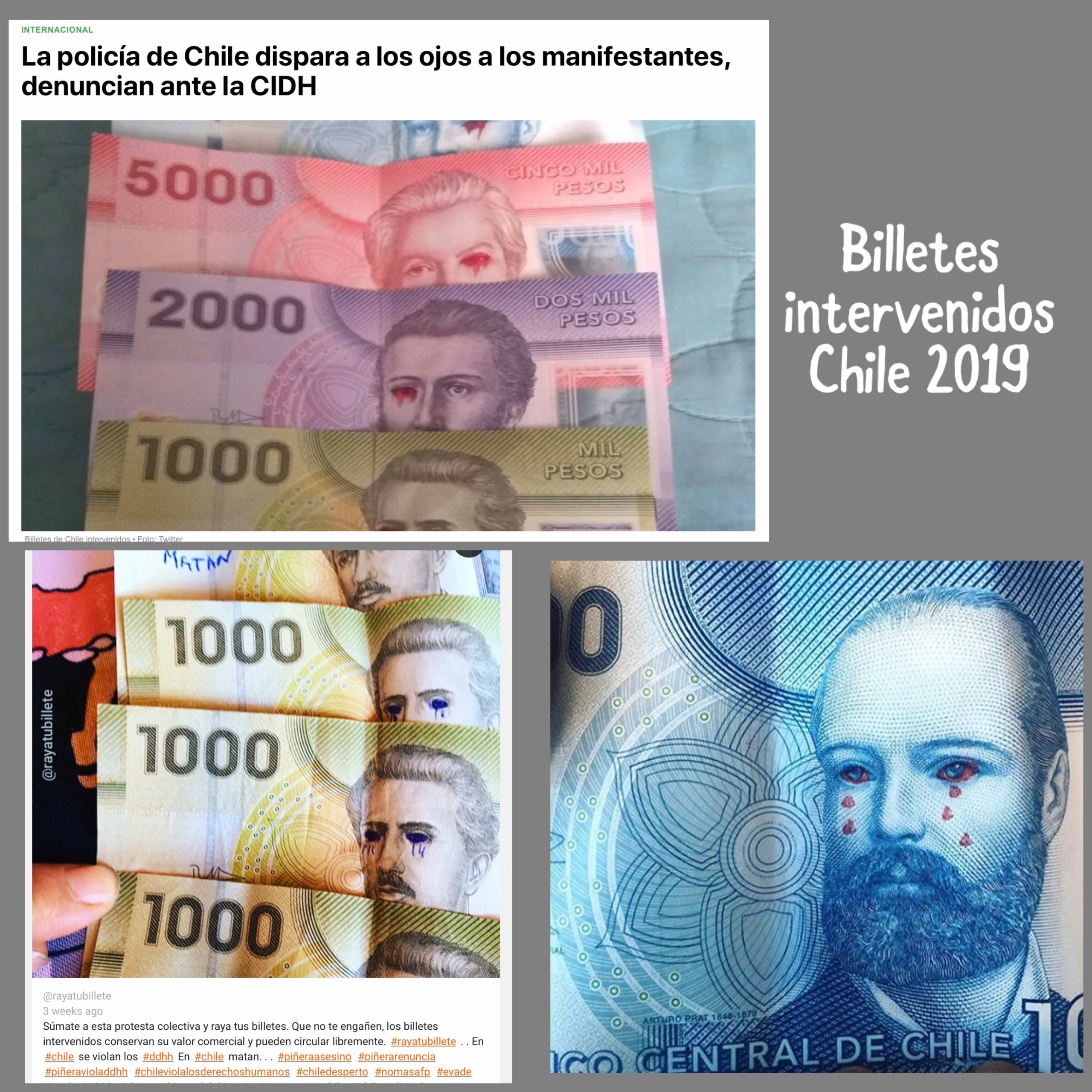 La tradición de intervenir billetes con un sentido políticos tiene muchos antecedentes. Uno de los últimos casos es conmovedor y vale la pena mostrarlo. Desde fines de 2019 las movilizaciones en Chile originaron duras represiones a manos de los Carabineros. Debido a que lo hicieron (y aún lo siguen haciendo) con balas de goma que disparan a los ojos de los manifestantes, grupos de resistencia y movimientos sociales promovieron la intervención de los billetes para mostrar las consecuencias de esta forma de represión estatal y así es posible ver gotas de sangre que emanan de los ojos de los próceres retratados en los billetes. Llora Chile.