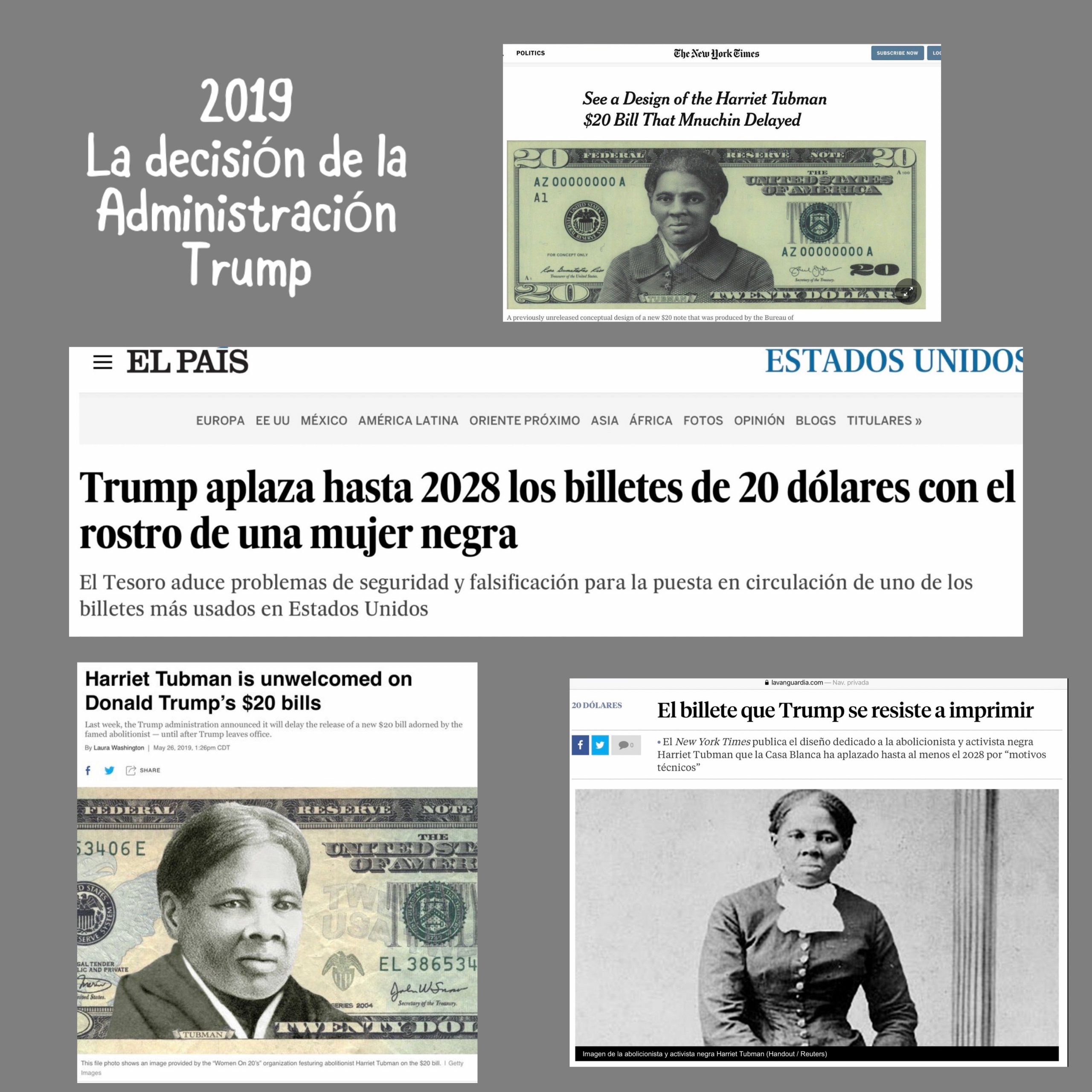 Pero pasaron cosas. En mayo de 2019 el New York Times publicó la imagen del prototipo del billete diseñado por el Tesoro junto a una nota en la que explicaba que la administración Trump había decidido posponer la impresión de los billetes hasta 2026 (y su circulación hasta 2028) debido a problemas técnicos. La excusa fue tan poco creíble que origino muchas criticas. Los medios reflejaban una obviedad: Harriet no era bienvenida para Trump. Era mujer, era negra. Demasiado para Donald.