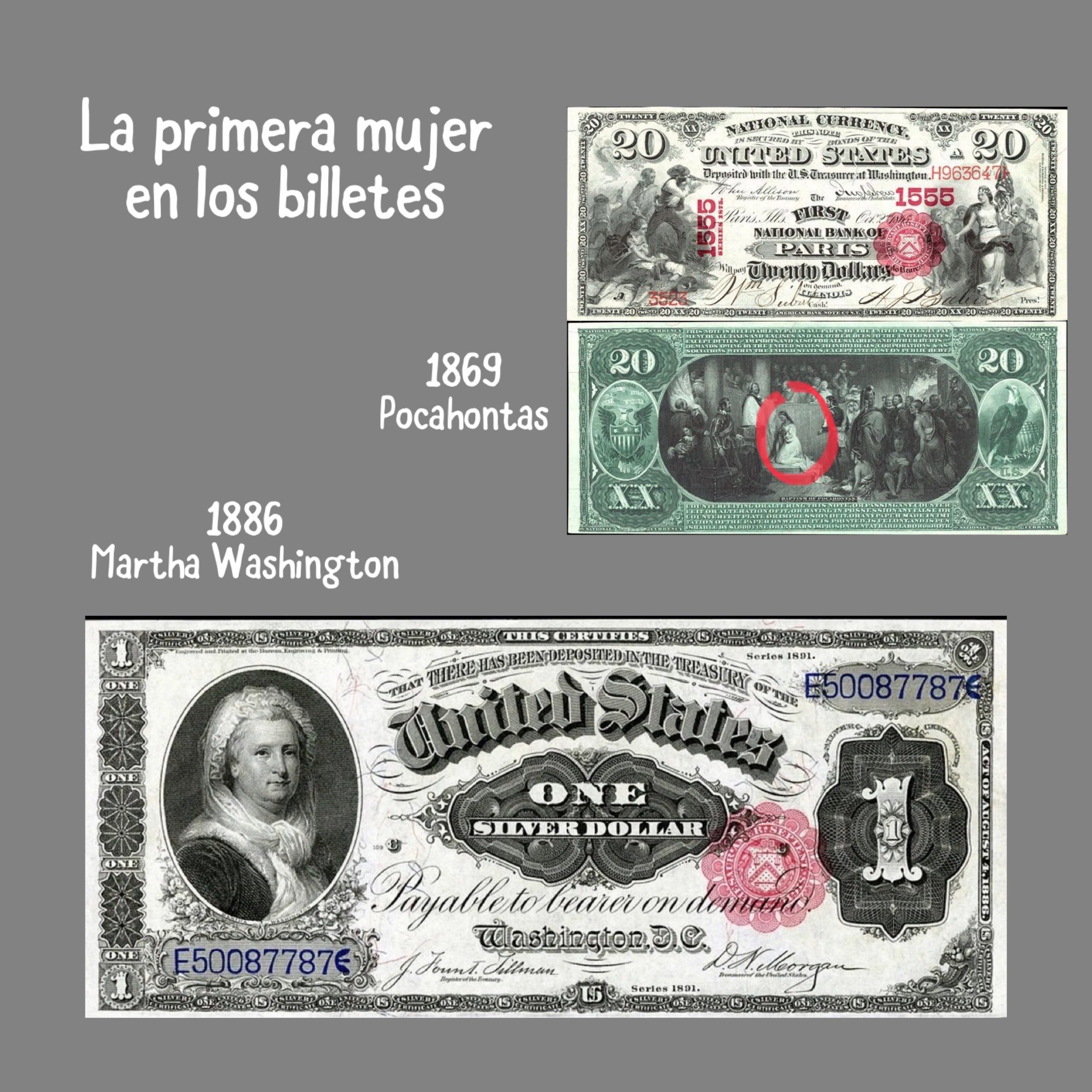 Sin embargo, fue en los Estados Unidos donde se desarrolló uno de los primeros discursos visuales estatales inclusivos y democráticos. Fue en los Estados Unidos donde por primera vez se representó a una mujer “no monarca” tanto en billetes como en estampillas. Pese a que años antes en el dorso de un billete se había representado el casamiento de Pocahontas, en 1886 el billete de un dólar de plata (que circulaba junto a los billetes ordinarios) tuvo en su frente la imagen de Martha Washington.
