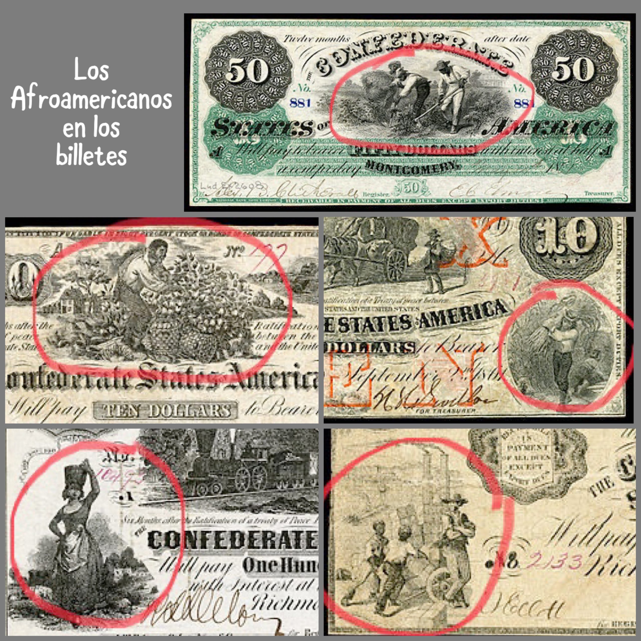Sin embargo, también fue en los Estados Unidos donde por primera vez fueron representadas afroamericanos en billetes pero no precisamente en un sentido inclusivo. Fue durante la guerra civil de secesión desarrollada entre 1861 y 1865. Emitidos por la Confederación de los secesionistas del sur que defendían la esclavitud, muchos de los billetes estaban ilustrados con imágenes de afroamericanos esclavos trabajando.