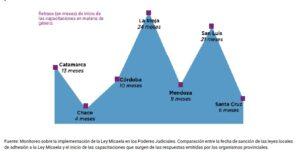 En varias provincias se observa una demora significativa entre la adhesión a la Ley Micaela a nivel provincial y el inicio de las capacitaciones en los Poderes Judiciales. Tal retardo injustificado perpetúa la composición de tribunales sin perspectiva de género y repercute negativamente en la vida de las mujeres y las diversidades.