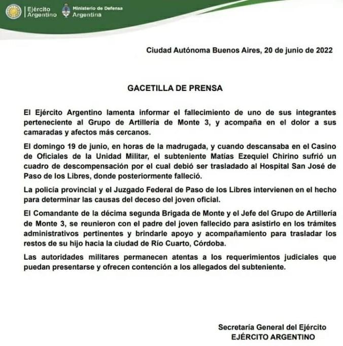 Parecen darle la razón quienes en otros grupos de WhatsApp escribieron: “El Ejército actuó de inmediato y para encubrirlo lo llevó a la Justicia local, haciendo la autopsia la Policía de Corrientes. La causa pasó al fuero federal como corresponde y hay una nueva autopsia de Gendarmería. Lo que dice el padre es desgarrador; han actuado así x q Chirino es hijo de un civil laburante y no hijo de un garca coronel o general. Va camino a ser como el caso Carrasco, esperemos que esta vez el hilo no se corte por lo más delgado”.