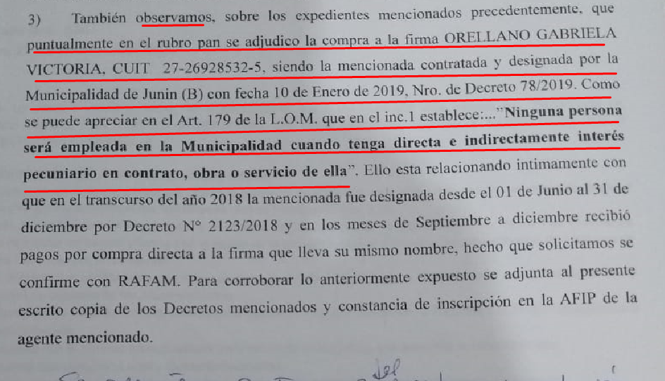 Una denuncia del bloque de concejales del Frente Renovador sobre el Servicio Alimentario Escolar que ofrece el Municipio apunta al intendente, dado que en el rubro panadería existió un único oferente. “Según los antecedentes era una persona que trabajaba prestando servicios en la Municipalidad. Había un vínculo muy cercano también con la familia del intendente”, cuenta Carolina Echeverri, concejala del FR. “Tenía una inscripción en AFIP muy cercana a la fecha. Esa licitación era por más de 1.000.000 de pesos. La persona que ganó la licitación presta servicios de asistente social. Manifestamos todas las irregularidades que vimos en el expediente en la sesión con copia al Tribunal de Cuentas, para que examine y observe el pliego licitatorio, quién se presentó, cómo se contrató, cómo salió el decreto. Pero hasta el día de la fecha no obtuvimos respuesta”, precisa Echeverri.
