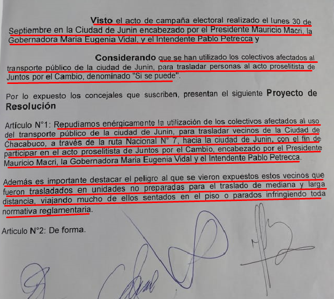 “Nos decían que no podíamos tener el transporte público después de 25 años. Se pudo”, dijo el intendente Petrecca en la plaza. “El transporte público se licitó con una empresa armada dos meses antes del llamado a licitación. Son unidades con más de 10 años de uso. Es todo muy raro, son unidades muy grandes que no las usaban más en Buenos Aires”, explica Carolina Echeverri. En el Concejo Deliberante de Junín se realizó un repudio y un pedido de informes, “porque la empresa de servicio público de transporte fue a Chacabuco a buscar gente por la mañana en colectivos y cuando finalizó el acto fueron llevadas nuevamente. Este es un servicio subsidiado que paga a la Municipalidad con fondos de los juninenses”, señala. Macri, Vidal, Petrecca y el ministro de Transporte Guillermo Dietrich inauguraron el lunes la ruta 7 que presenta solamente un 60% de avance de obra. Luego de la inauguración vinieron los despidos por parte de la contratista de 40 trabajadores del obrador de la ruta 7. Sí, se puede.