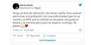 Sabrina Basile, hija del ex futbolista y entrenador, se hizo conocida cuando murió su madre. Negó la versión que decía que se había contagiado Covid-19 y atribuyó el óbito a que se había cerrado la importación de la droga que usaba. Además posteó: