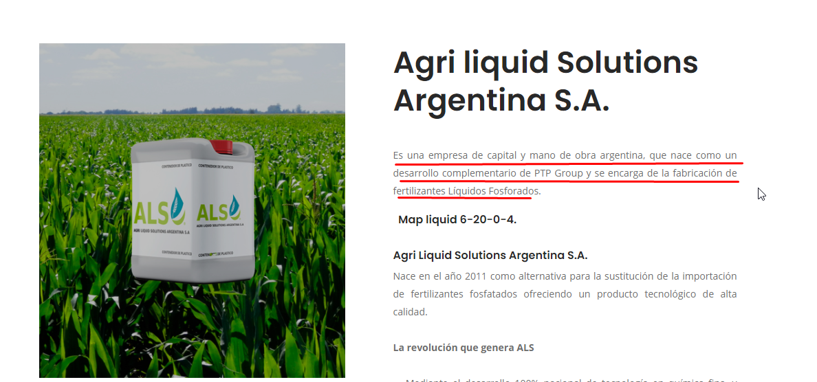 La empresa PTP Warrant S.A de Guillermo Misiano, ubicada en el partido de Ramallo y con habilitación de “servicios logísticos” desde 2013, contrató a Agri Liquid Solutions (ALS), una firma complementaria del mismo grupo PTP que se dedica a la fabricación de fertilizantes líquidos fosforados. ALS no está habilitada por la Municipalidad y el espacio que ocupa no está reconocido como zona industrial. Una denuncia de la asociación Unidos por Vida y el Medio Ambiente (UPVA) y el Foro Medio Ambiental (FOMEA) llevó al fiscal Matías Di Lello a dar intervención al Departamento de Delitos Ambientales de Policía Federal, que tomó muestras líquidas y sólidas para analizar al costado del predio donde corre un cauce de agua que desemboca en el río Paraná. Las muestras están fuera de los parámetros establecidos en la Ley 24.051 de residuos peligrosos. El Juzgado Federal 2 de San Nicolás dispuso allanamientos en las empresas de los Misiano.