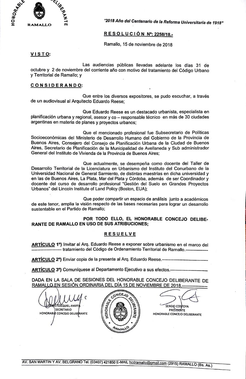 En las audiencias de 2018 invité a disertar al arquitecto Eduardo Reese, director del área de Derechos Económicos y Sociales del CELS, quien participó a través de un video. “El hecho de promover el desarrollo económico del municipio no puede ir en desmedro de otros derechos y de otras cualidades del municipio como lo es la calidad ambiental”, destacó. A los concejales de todos los bloques les interesó su mirada y en noviembre de 2018 resolvieron por unanimidad invitarlo a exponer sobre urbanismo en el marco del tratamiento del Código de Ordenamiento Territorial de Ramallo. Reese no pudo estar porque había asumido compromisos con anterioridad y la invitación no volvió a repetirse.