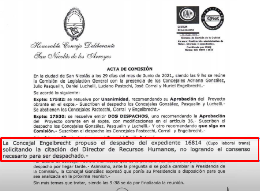 La concejala que pidió la citación recordó también“que el expediente de cupo laboral trans está encajonado por los concejales de Juntos por el Cambio desde el 1º de noviembre de 2018, sin importarles que se dé tratamiento ni lugar a este derecho”. Engelbrecht dijo que su indignación y disgusto “vuelven a ser muy grandes” dado que no quieren citar al director de recursos humanos del Municipio para que brinde explicaciones del motivo por el que no pueden cumplir con el cupo trans “siendo su principal argumento que el ‘Ejecutivo no está tomando personal’”.