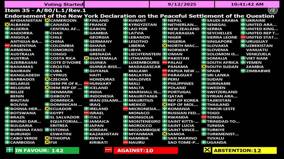La última muestra de desmesura en la ONU ha tenido lugar el pasado 12 de septiembre, cuando la Asamblea General aprobó la “Declaración de Nueva York”, un documento que apoya la solución de dos Estados para Israel y Palestina, y condena a Hamás. La propuesta, impulsada por Francia y Arabia Saudita, obtuvo 142 votos a favor, 10 en contra —entre ellos los de Estados Unidos, Israel, la Argentina y Hungría— y 12 abstenciones. La decisión, a la vez que rompe la tradición diplomática del país, socava su reclamo soberano sobre las Islas Malvinas, al sentar un precedente a favor de la ocupación extranjera. Este posicionamiento contrasta, incluso, con el de gobiernos tan disímiles como los de Cristina Fernández (2007-2015) y Mauricio Macri (2015-2019), que habían reconocido a Palestina como Estado o apoyado la solución de dos Estados.