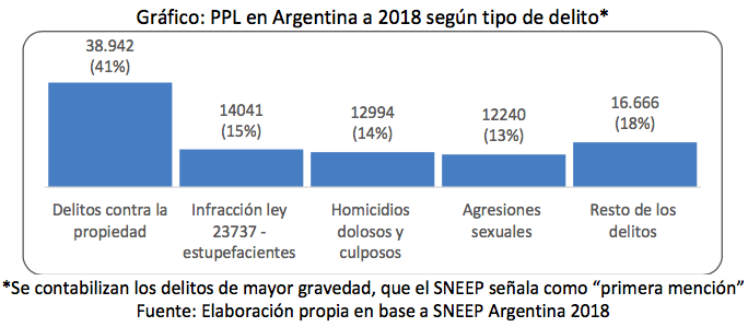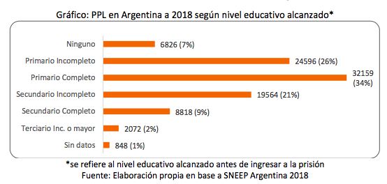 Los datos recabados señalan que el 62% de los detenidos se encuentran en un rango etario de veinticinco a cuarenta y cuatro años. A la vez que previo al ingreso a la prisión, la mayoría se encontró con graves dificultades en el acceso al trabajo y educación. En cuanto a la situación laboral anterior, el 43% indicó que se encontraba desocupado/a y el 39% que trabajaba a tiempo parcial, lo que la Organización Internacional del Trabajo asimila a trabajo precario. En lo referente al nivel educativo alcanzado sólo el 34% dispone del primario completo antes de ingresar a la cárcel y el 9% del secundario. Respecto a la distribución por género, las mujeres representan el 5% de las personas detenidas en Argentina, y 162 de ellas están presas junto a sus hijos/as menores de edad.