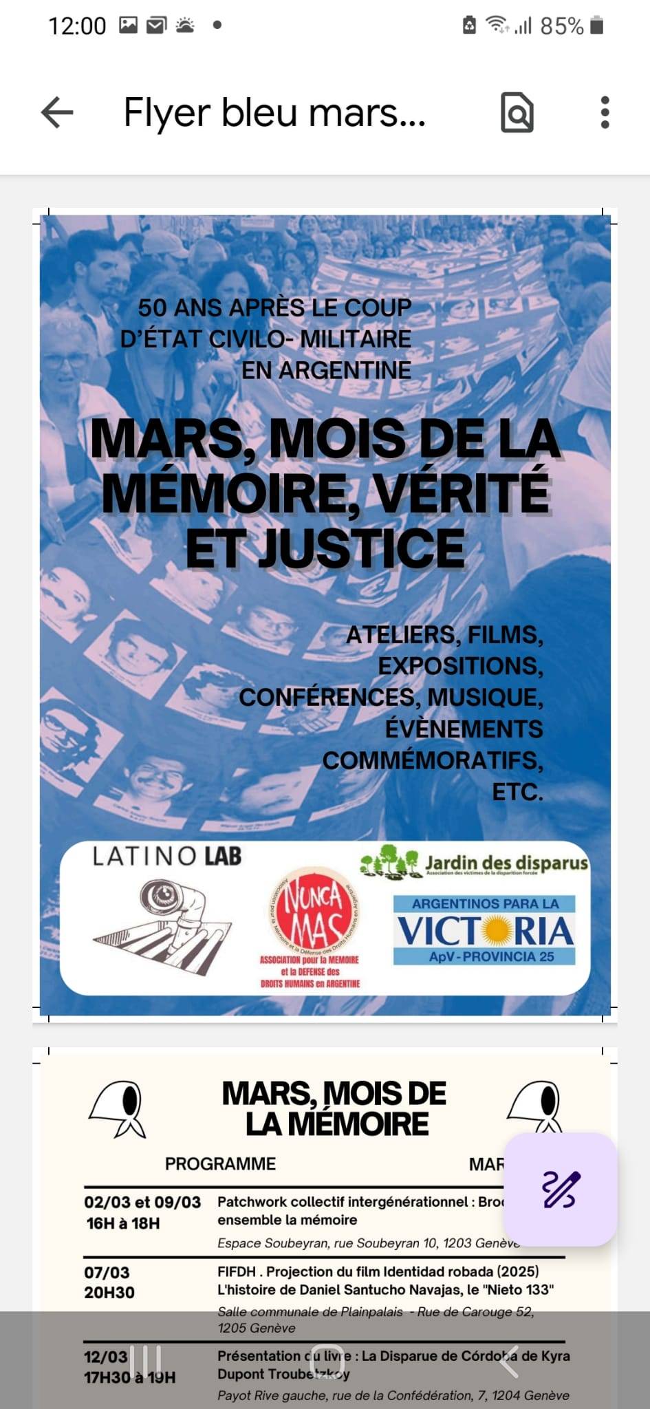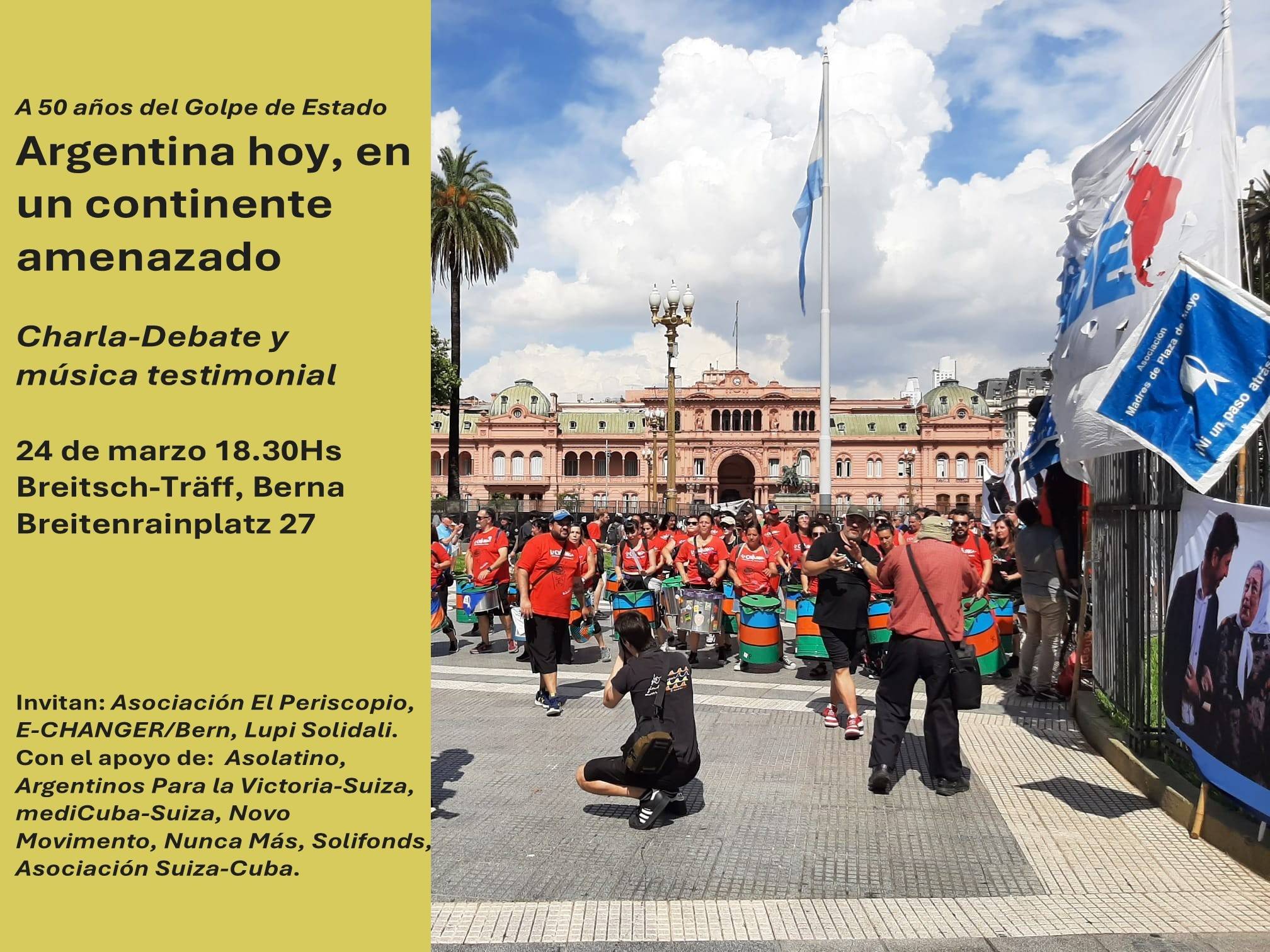 A partir del 2 de marzo y hasta fin de mes se realiza una decena de muy diversas actividades en Ginebra y en Berna, como el bordado de un patchwork por la memoria; presentación de libros y proyección de películas; un coloquio universitario y una video conferencia con el Colectivo INTERMESAS de Sitios de la Memoria de la Argentina. Otras cuantas organizaciones convocan el mismo 24 de marzo, en la capital suiza, una actividad político-cultural centrada en la actual situación argentina en un “continente amenazado”.