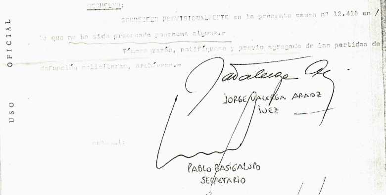 El expediente recayó entonces en el Juzgado de Instrucción 28 a cargo de Jorge Valerga Aráoz, que en 1985 sería uno de los jueces en el Juicio a las Juntas. En una página y media, Valerga Aráoz sobreseyó la causa, equiparando –en un anticipo de lo que sería la “teoría de los dos demonios”– las versiones de sobrevivientes y de victimarios. No tomó declaración alguna, ni evaluó las que ya obraban en el expediente. “Los presos declararon ante el propio personal penitenciario. Aun en esas condiciones, muchos de ellos contaron lo que había pasado”, destaca Cesaroni, entrevistada por El Cohete. El documento de sobreseimiento firmado por el magistrado falsea los hechos al describir un auxilio de los bomberos, que no se produjo porque el personal penitenciario no permitió su ingreso.