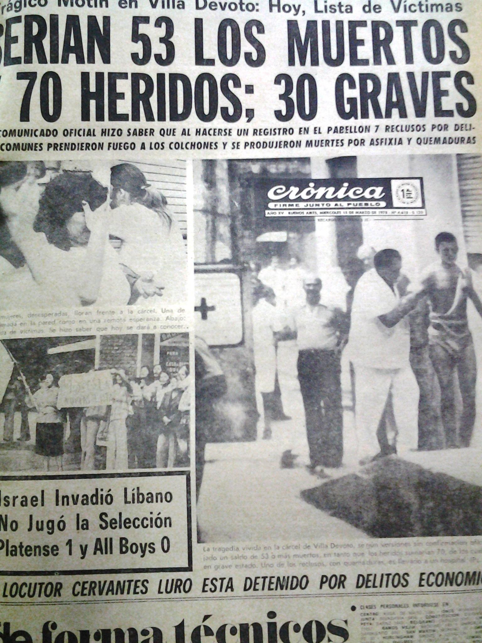 A mediados de marzo de 1978, al menos 64 personas fueron asesinadas en el interior del séptimo pabellón de la cárcel de Villa Devoto por unos 40 agentes del Servicio Penitenciario Federal. Los penitenciarios dispararon armas de fuego y gases lacrimógenos que, combinados con el kerosene que alimentaba a los calentadores del penal, produjeron un incendio que tomó a los colchones con que los internos habían intentado resistir. Las puertas cerradas por los guardiacárceles terminaron de dar forma a la masacre.