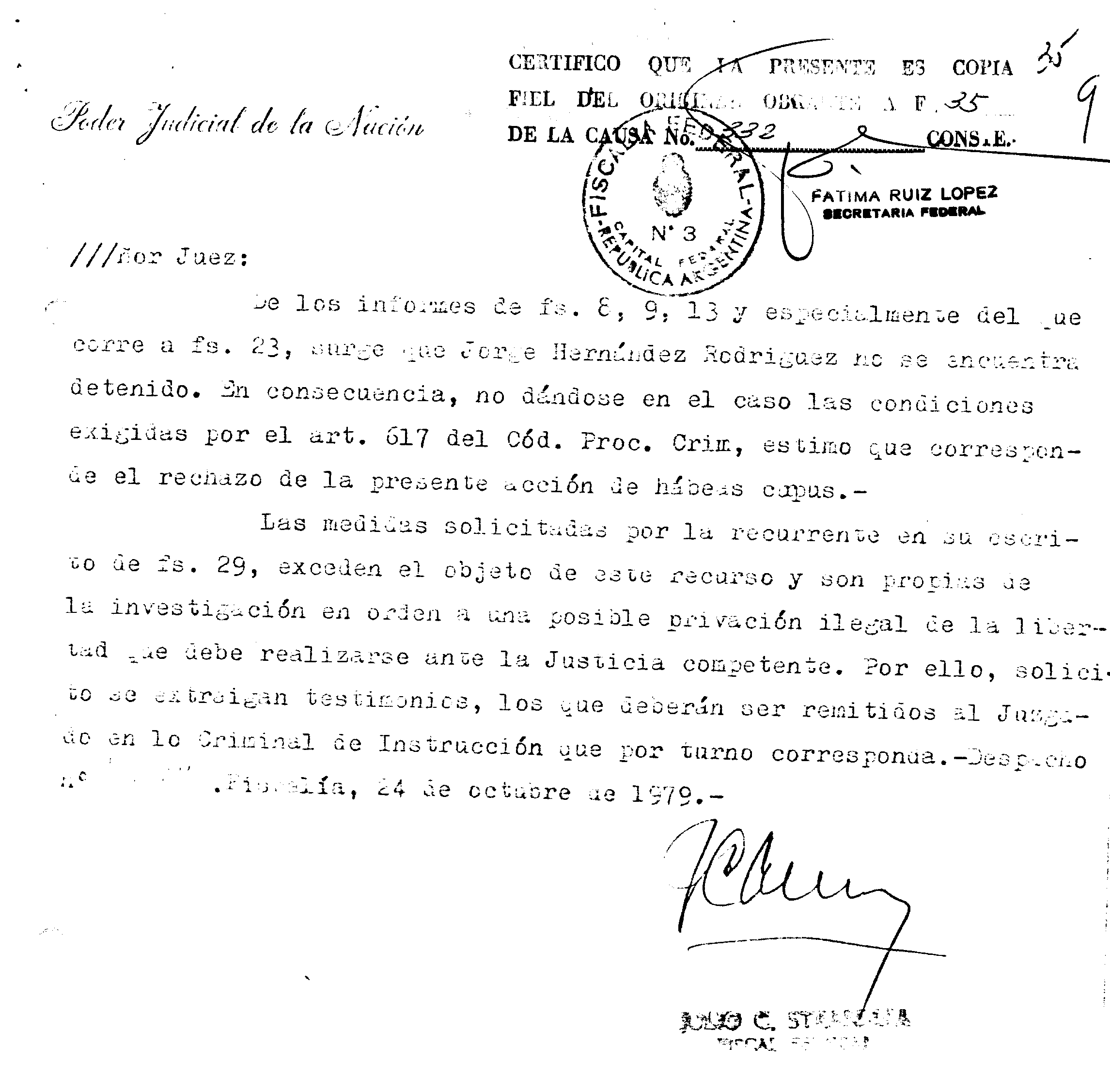 En 1979, Strassera había intervenido ante un recurso de hábeas corpus de la familia Hernández Rodríguez, al que terminó respondiendo en media carilla, producto de una mera práctica burocrática, abordándolo como un posible delito común.