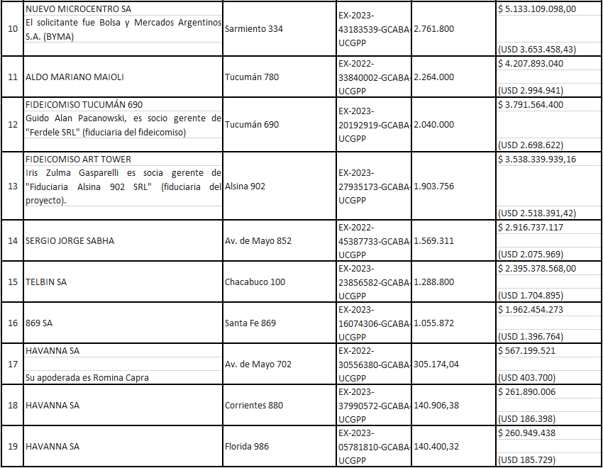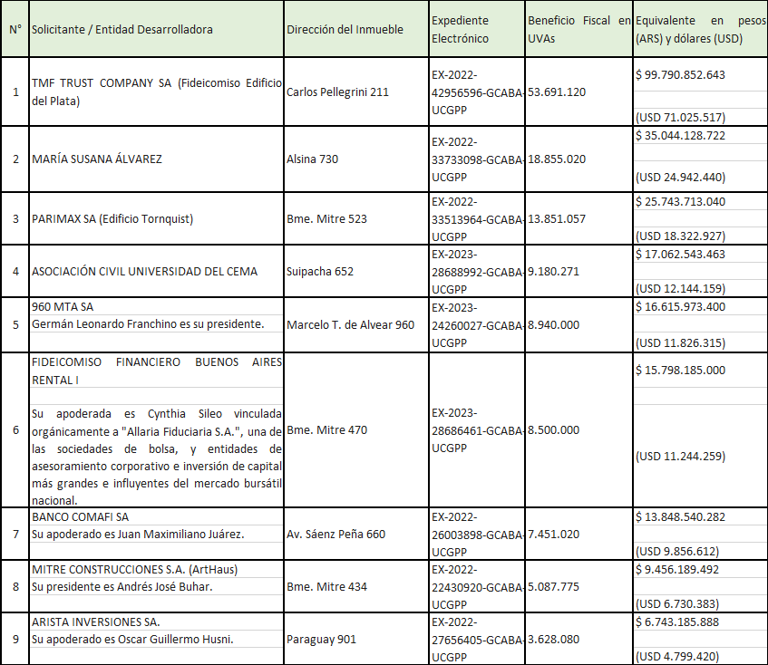 El análisis de la distribución de estos subsidios revela una profunda concentración de recursos. Los cinco proyectos más beneficiados acaparan una proporción mayoritaria del esfuerzo fiscal de la ciudad. A la cabeza se encuentra el fideicomiso Edificio del Plata, al que le siguen, en orden de magnitud, el proyecto de Alsina 730, el edificio Tornquist, el inmueble de la UCEMA y el desarrollo en Marcelo T. de Alvear 960.