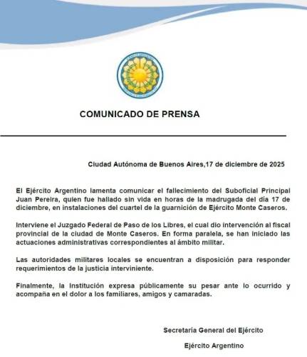 “El Ejército Argentino lamenta comunicar el fallecimiento del Suboficial Principal Juan Pereira, quien fue hallado sin vida en horas de la madrugada del 17 de diciembre, en instalaciones del cuartel de la guarnición de Ejército Monte Caseros... Las autoridades militares locales se encuentran a disposición para responder requerimientos de la Justicia interviniente. La institución expresa su pesar ante lo ocurrido y acompaña en el dolor a los familiares, amigos y camaradas”.