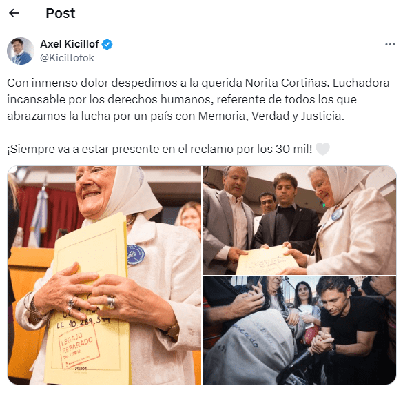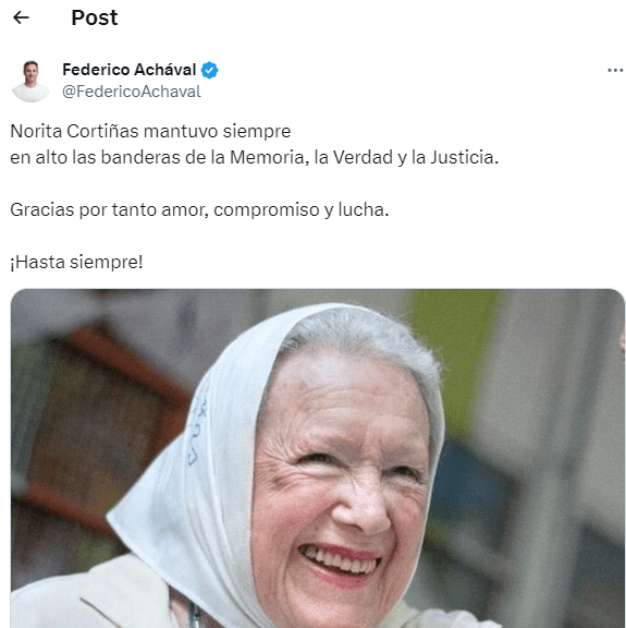 Federico Achával, de Pilar: “Norita Cortiñas mantuvo siempre en alto las banderas de la Memoria, la Verdad y la Justicia. Gracias por tanto amor, compromiso y lucha. ¡Hasta siempre!”.