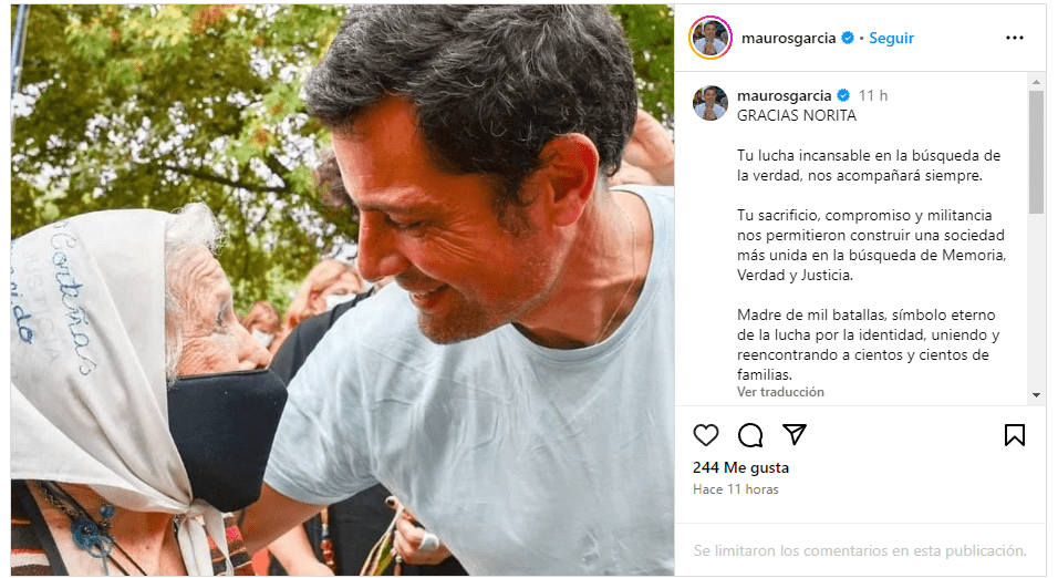 El ex ministro de Interior, Wado de Pedro, saludó: “Hasta siempre Norita, ejemplo de lucha permanente y compromiso por la defensa de los derechos humanos. Seguiremos el legado, militando por la Memoria, la Verdad y la Justicia”.