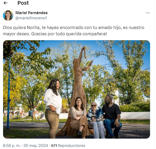 Mariel Fernández, de Moreno: “Dios quiera, Norita, te hayas encontrado con tu amado hijo; es nuestro mayor deseo. ¡Gracias por todo, querida compañera!”.