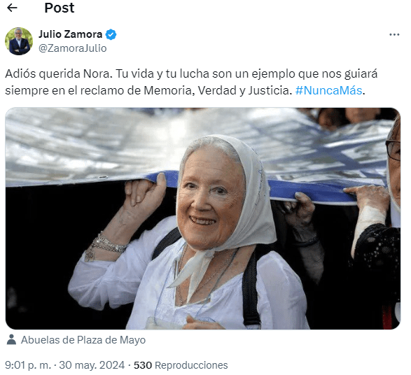Julio Zamora, de Tigre: “Adiós, querida Nora. Tu vida y tu lucha son un ejemplo que nos guiará siempre en el reclamo de Memoria, Verdad y Justicia”.