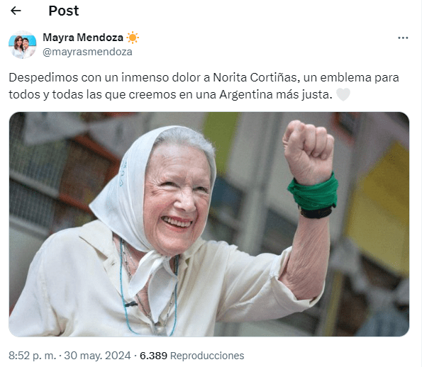 Mayra Mendoza, de Quilmes: “Despedimos con un inmenso dolor a Norita Cortiñas, un emblema para todos y todas las que creemos en una Argentina más justa”.