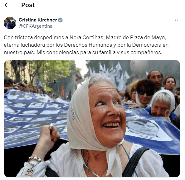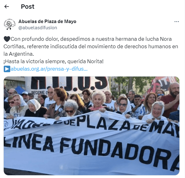 El jefe comunal de la capital bonaerense, Julio Alak, escribió: “Con un inmenso dolor despedimos a Nora Cortiñas, madre de un hijo detenido y desaparecido por la última dictadura y cofundadora de Madres de Plaza de Mayo. Estará siempre en nuestra memoria como una defensora incansable de los derechos humanos y como un ejemplo de valentía en uno de los momentos más oscuros de nuestra historia”.