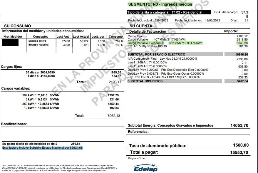 En la nueva segmentación tarifaria, los usuarios N3 tienen el cargo variable excedente discriminado en la factura. En el ejemplo de la provincia de Buenos Aires que se muestra a continuación, se puede observar una boleta de $ 15.553 con 407 kWh de tarifa subsidiada ($ 2.918) y 362 kWh de tarifa plena ($ 5.043). A estos conceptos se le agregan el del cargo fijo y los impuestos. Mantiene un subsidio del Estado Nacional por $ 6.924.