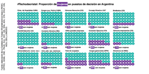Según el informe ya citado de ELA, las mujeres ocupan 4,4% de los máximos cargos ejecutivos (CEO, Presidente/a, Director/a General) de las grandes empresas, listadas como las 1000 empresas con la facturación más alta en 2009 según la Revista Mercado. [11] Solamente 7% de los miembros de las comisiones directivas de cámaras empresarias son mujeres. [12]