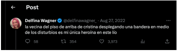 - Mesa-Wagner, la panelista servicial de Crónica, publicó sobre Tezanos Pinto el 27 de agosto: “La vecina del piso de arriba de Cristina en el medio de los ‘disturbios’ es mi única heroína en este lío”.