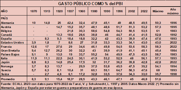 Ya en los ‘80, dos investigadores del FMI, Vito Tanzi y Ludger Schuknecht, realizaron diversos estudios empíricos sobre las consecuencias del aumento del gasto público en los países de la OCDE desde el inicio de la Primera Guerra hasta el presente, al amparo de la idea que de esa manera proveen de evidencia suficiente para evaluar las consecuencias negativas que engendra un aparato estatal sobredimensionado en sus atributos y funciones. Para Tanzi y Schuknecht, “quizás el nivel de gasto público no necesite ser más alto que, digamos, 30 % del PBI para alcanzar la mayoría de los objetivos importantes económicos y sociales que justifican la intervención del gobierno”.