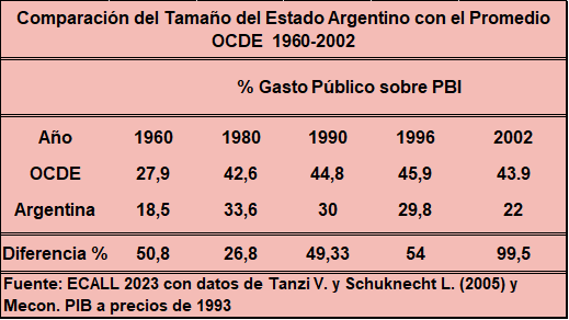Con los gastos públicos cercanos al 50 % del producto bruto de 8 países que explican algo más del 70% del producto bruto mundial (y que, por lo tanto, son ejes de la cultura occidental, es decir, sus valores y símbolos) los principales problemas políticos resultan ser la incidencia de los impuestos y la asignación de las partidas presupuestarias. Evidentemente, la tesis ampliamente propagada que atribuye el origen de las crisis padecidas por la Argentina al tamaño del gasto público —hecha carne y eje del DNU 70— es al menos inconsistente a la vista de la comparación internacional. Lo interesante del caso es que la Argentina siempre tuvo un Estado entre pequeño y muy pequeño durante el transcurso de las cuatro últimas décadas en que operó el importante aumento del sector público en los países industriales.