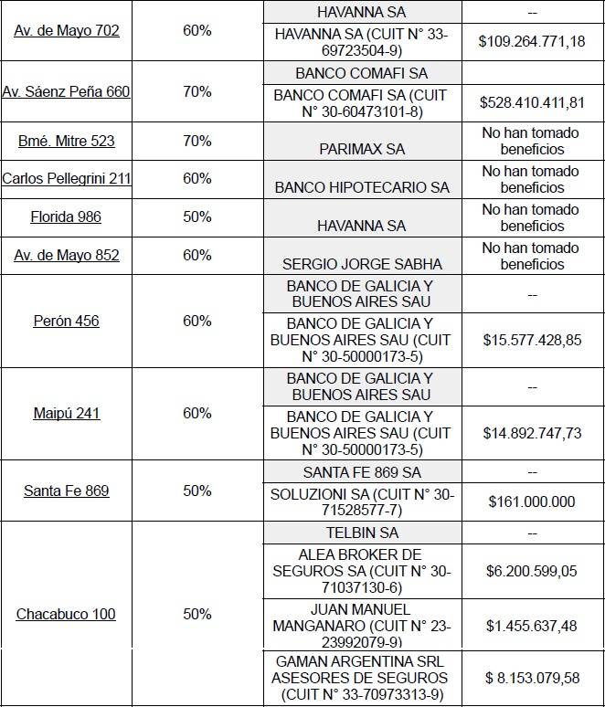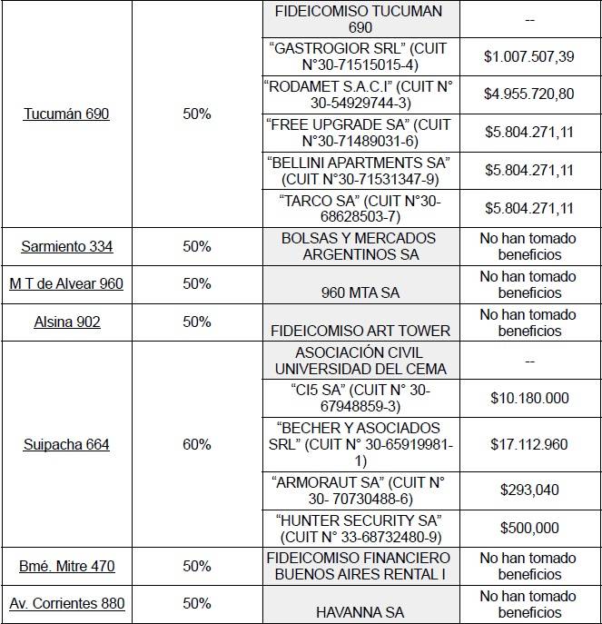 En el listado de beneficiarios, hay proyectos de edificios no construidos, por ejemplo el de Alsina 730. Según lo declarado por la propietaria, María Susana Álvarez, al momento de realizar la propuesta el edificio se encontraba en la etapa de construcción del subsuelo. La sociedad porteña costearía el 60% de los 26 pisos. No se comprende en este caso dónde estaría la “rehabilitación” o “refuncionalización” de un edificio que aún no existe.