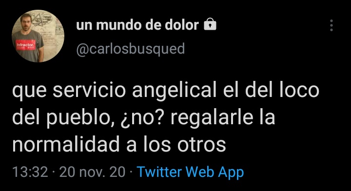 Tres formas tan distintas de vivir, que produjeron bellezas —un legado, se podría decir en términos más formales— con las que al menos yo seguiré dialogando hasta el final, sus fantasmas como amigos imaginarios. Hace poco leía que existen horas de tomas descartadas de Mrs. Doubtfire, en las que Williams improvisa bromas que hubiesen condenado al film a una calificación exclusiva para adultos. Todavía existe música de Bowie que no he descubierto, y en la lista de libros favoritos que difundió hay muchos que aún no leí. Creo haber pispeado que Busqued dejó un texto inédito, y aunque así no fuese sé que resurgirán posteos suyos que perdí en su momento y que me harán sonreír. Ayer, sin ir más lejos, alguien le dio RT a uno que decía lo siguiente: qué servicio angelical el del loco del pueblo, ¿no? regalarle la normalidad a los otros.