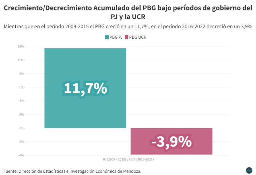 Como la deuda pública aumentó y el Producto Bruto Geográfico (PBG) consolidó su tendencia al retroceso, la primera robusteció 2,5 puntos su peso con relación al segundo entre 2016 y 2019. Se explica porque ese lapso inició con el primer shock de endeudamiento y finalizó completando una caída de 5,6% del PBG. La recesión inició en 2016, dado que el PBG de la provincia había crecido en el lustro anterior. El gráfico del CEFI es útil para diferenciar etapas y proyectos políticos.